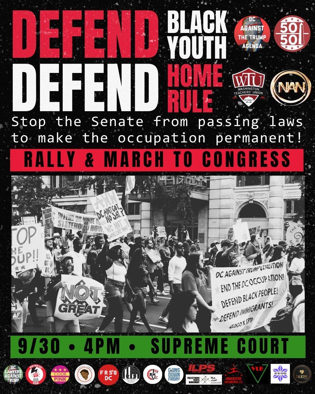 Defend Black Youth Defend Home Rule Stop the Senate from passing laws to make the occupation permanent! Rally and march to from the Supreme Court to the Capitol Building.